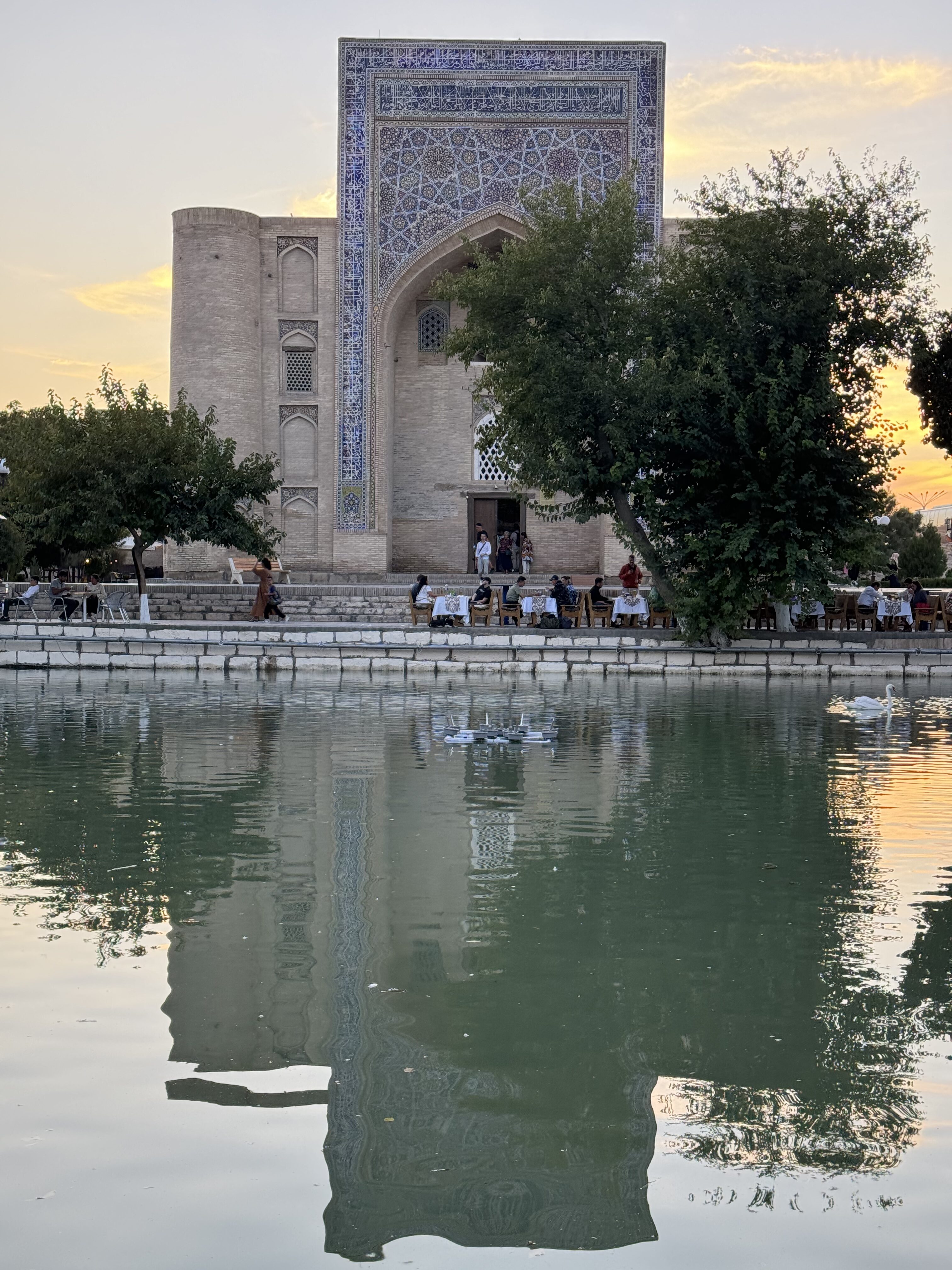 Начинаем у памятника Ходже Насреддину — самого весёлого философа Востока, который улыбается нам навстречу, сидя на своём бронзовом осле. Ляби-Хауз, водоём, где собирается вся Бухара: и пожилые горожане, обсуждающие новости, и дети с мороженым, встречает нас зеркалом воды и тенью платанов. За углом — кукольный театр, где до сих пор оживают легенды. Через торговые купола, наполненные шелками, специями и звоном медной посуды, мы пойдем к мечети Магоки-Аттори — одной из древнейших в Средней Азии, стоящей на перекрёстке религий. Смотрим на стройные арки медресе Кош, вдыхаем тишину у мечети Калян, задираем голову к минарету Калян, который веками был главной вертикалью Бухары. И выходим к крепости Арк — тому самому месту, где когда-то сидели эмиры и вершилась история.